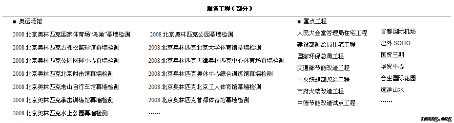 检测室先后承担了包括国家体育场“鸟巢”、五棵松奥运篮球馆等在内的十余个奥运场馆的幕墙检测以及人民大会堂、建设部、交通部等节能改造工程和奥林匹克花园、远洋山水、珠江帝景等住宅小区的门窗、幕墙工程竣工验收、节能验收、工程见证以及各类委托检验等,累计向社会各界出具了上千份科学、准确的检验报告,得到了广大客户及上级主管部门的一致好评。