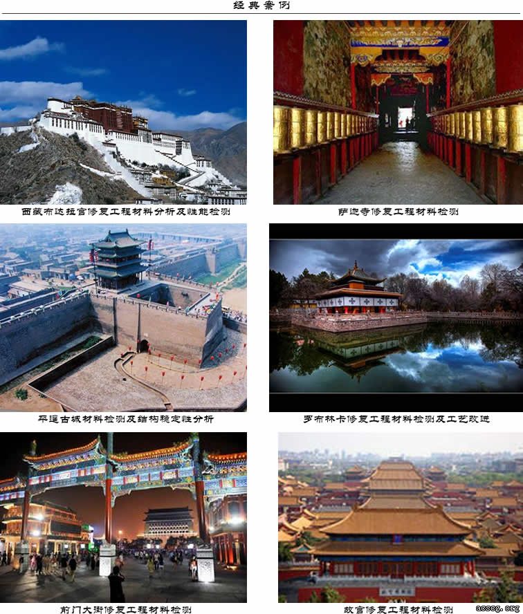 文物古建检测室由国家建筑材料测试中心建筑工程与材料检验认证事业部中相关专业检测技术专家组建而成,能承担文物古建材料的物理性能的检测,化学成份的分析;能承担文物古建结构安全的鉴定,并在线实时监控结构的安全性;能承担文物古建材料改性、施工工艺等技术服务。 本检测室服务范围:1、古建用瓦、砖、土、石灰、石材等物理性能检测、化学成份的分析,木材含水率、防腐等的检测;2、古建结构稳定性分析、鉴定及监测,地基基础的安全监测;3、古建环境检测;4、材料改性、施工工艺的改进等技术服务。